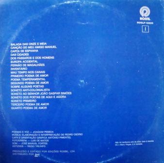 Poemas e voz - Joaquim Pessoa. Música: Elaboração e interpretação de Pedro Osório. Capa e orientação gráfica de António Pimentel. Fotografia - Luis de Matos. som - José Manuel Fortes. Produzido e editado por edições Rossil. Faixas:( Balada das onze e meia, Canção do meu amigo Manuel, Carta de Espanha, Das cidades, Dos pássaros e dos homens, Europa acidental, Fernão de Magalhães, Inventário, Mau tempo nos canais, Primeiro poema de amor, Poema temperamental, Segundo poema de amor, Sobre alguns poetas, Soneto anti-colunialista, Soneto ao senhor João Gaspar Simões, Soneto dos poetas de aqui e agora, Soneto primeiro, Terceiro poema de amor, Quarto poema de amor). Invulgar.