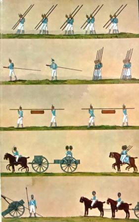 Avisos Militares Sobre el Servicio de la Cavalleria Y Dragones, en Guarnicion, Y Campaña que contienen La forma de estar en una Guarnicion, ó Quartel; El modo de hazer las marchas; Como ha de campar; El servicio dentro del Campo, de Guerra, y Economico; La Guardia; Las Partidas á la Guerra; La Emboscada; El Combate; El ataque de un Quartel Enemigo; El modo de cunrir un Forrage, y conducir un Comboy; El Exercicio preciso en la Guerra, y el que se enseña para demonstrar la destreza de los Soldados á la vista de un General. Tercera Edicion. Lisboa, MDCCLVII (1757). Na Offic. de Joseph da Costa Coimbra. In-8.º pequeno de 221 pága. Encadernação inteira de pele com gravações a ouro na lombada.